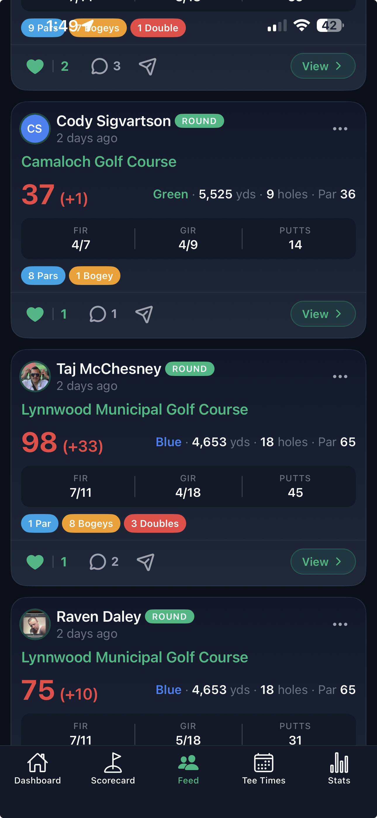 Share rounds, post tee times, and see what your golf friends are up to. Follow players, like their rounds, and build your golf community.