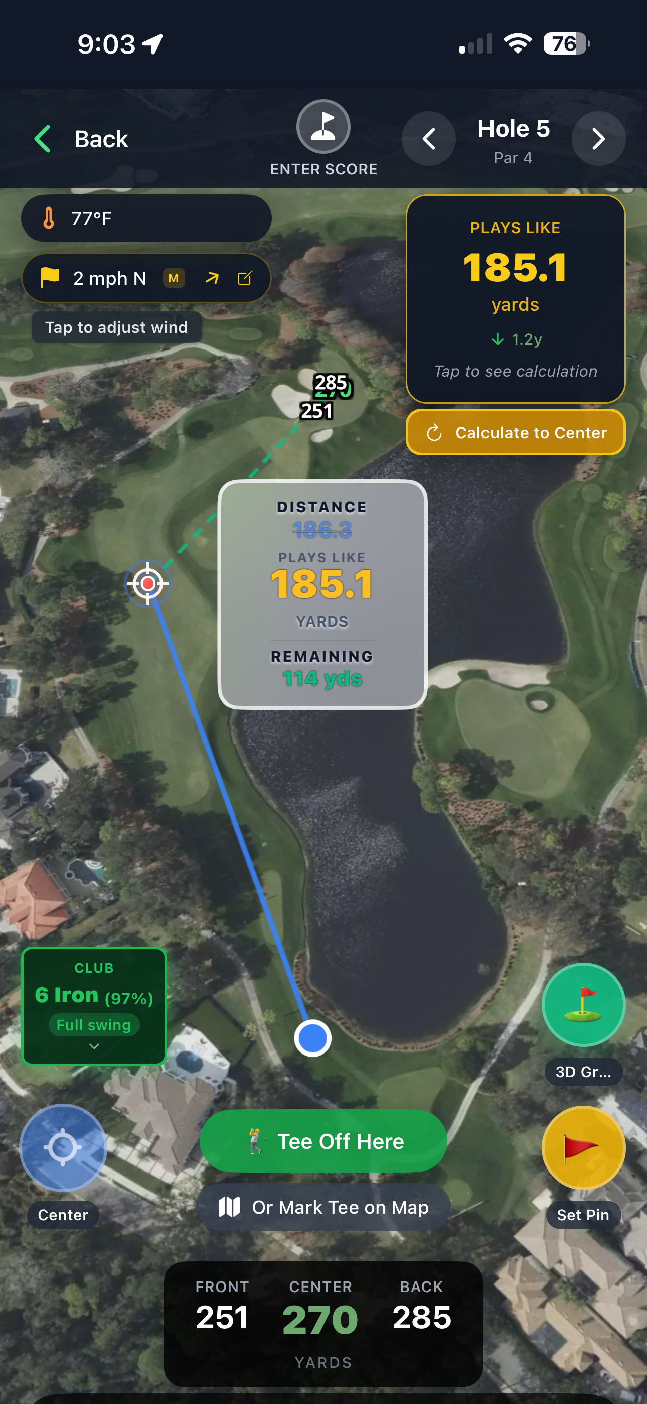 Our GPS doesn't just show yardage. It calculates "plays like" distance using elevation, altitude, wind, and temperature. Know exactly when to club up or down.