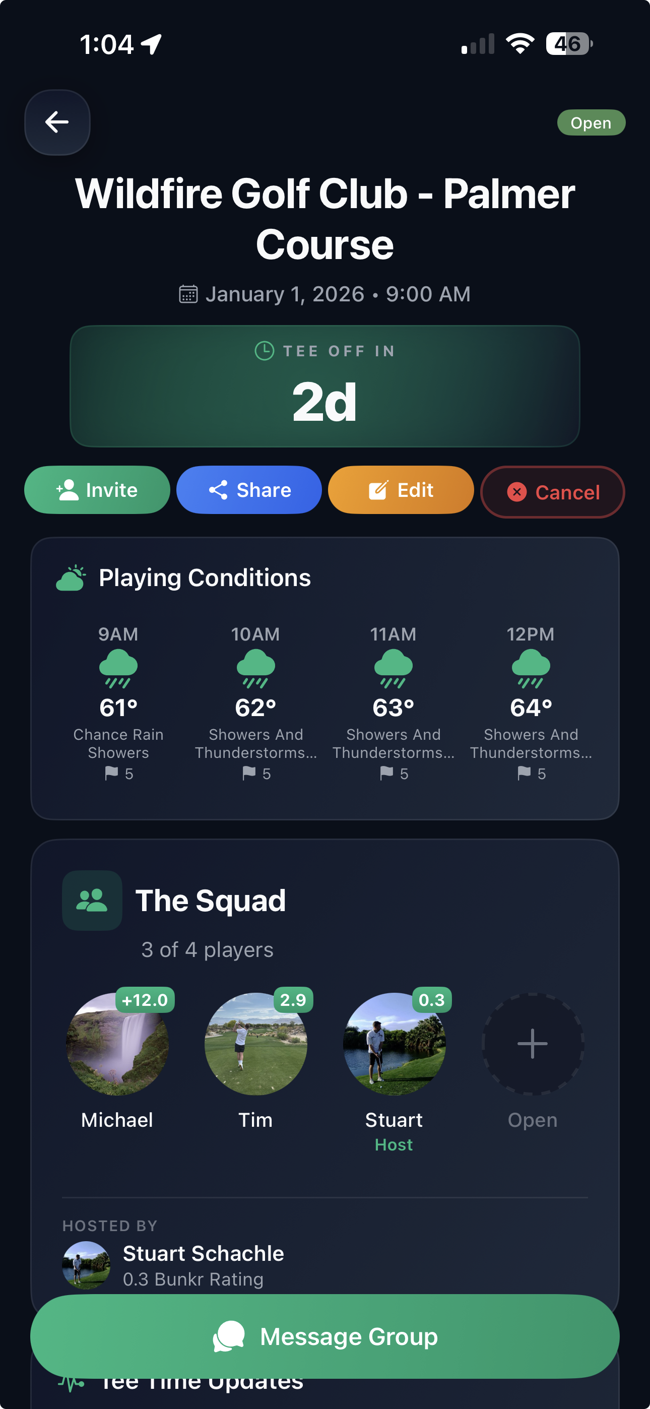 Create tee times, invite friends, and get everyone on the same page. Automatic reminders, group chat, and start your round directly from the tee time.